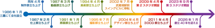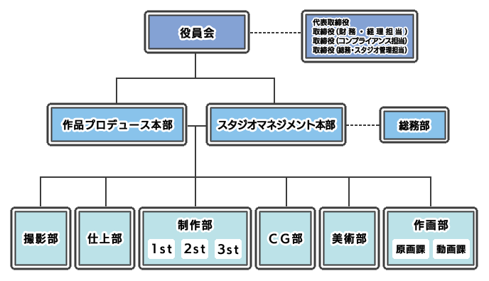 23:00を最終クローズとしている。業務上やむを得ず23:00を越えたい時は事前申請し、承認を得ることが必要となっており、アニメ業界からイメージされる「長時間・深夜・徹夜作業」といったルーズな業務形態は改善されている。尚、休日出勤についても振休取得を前提とした事前申請制を採用している。 |